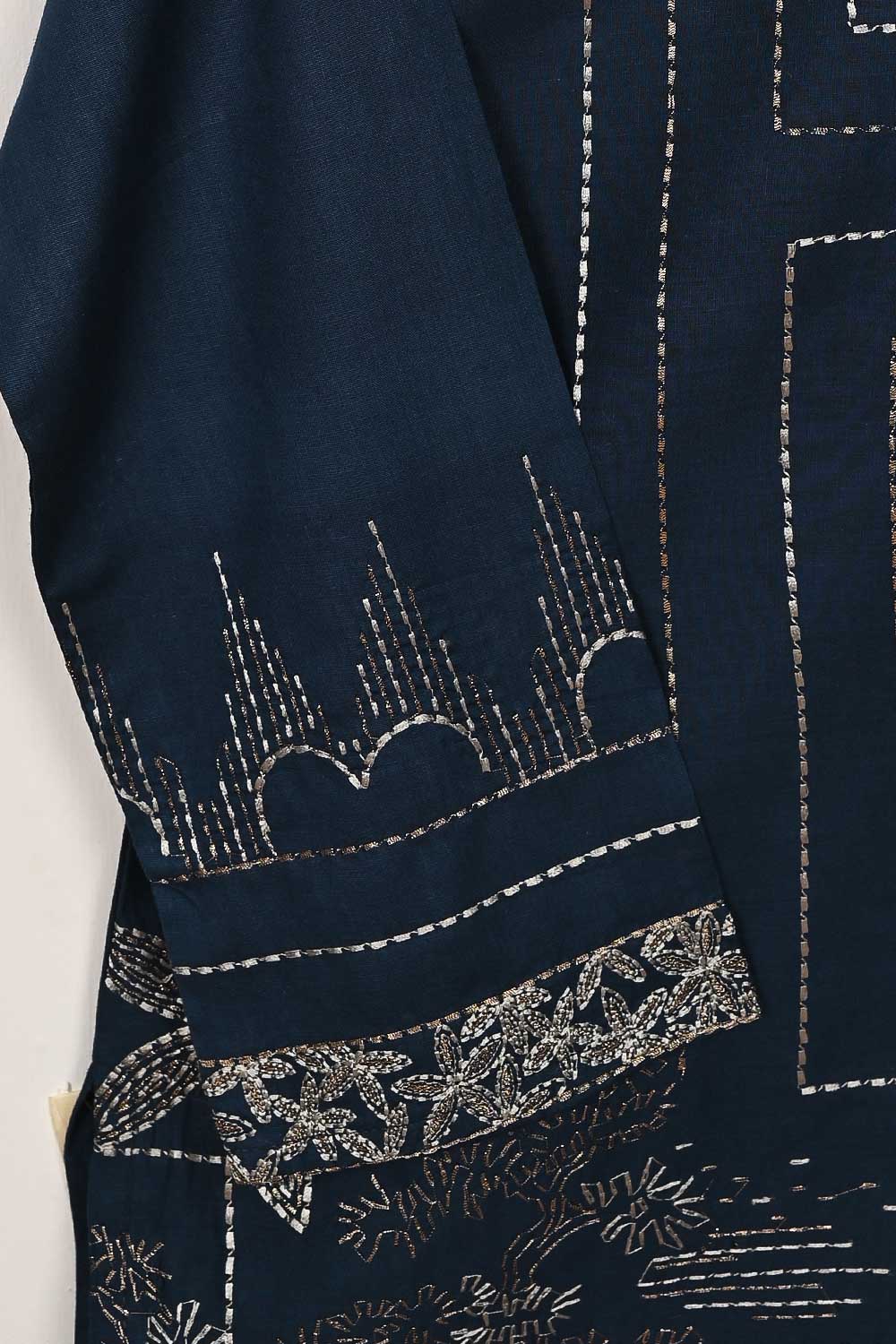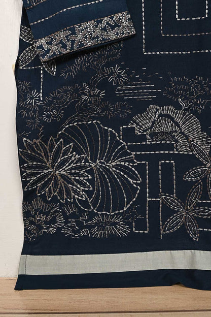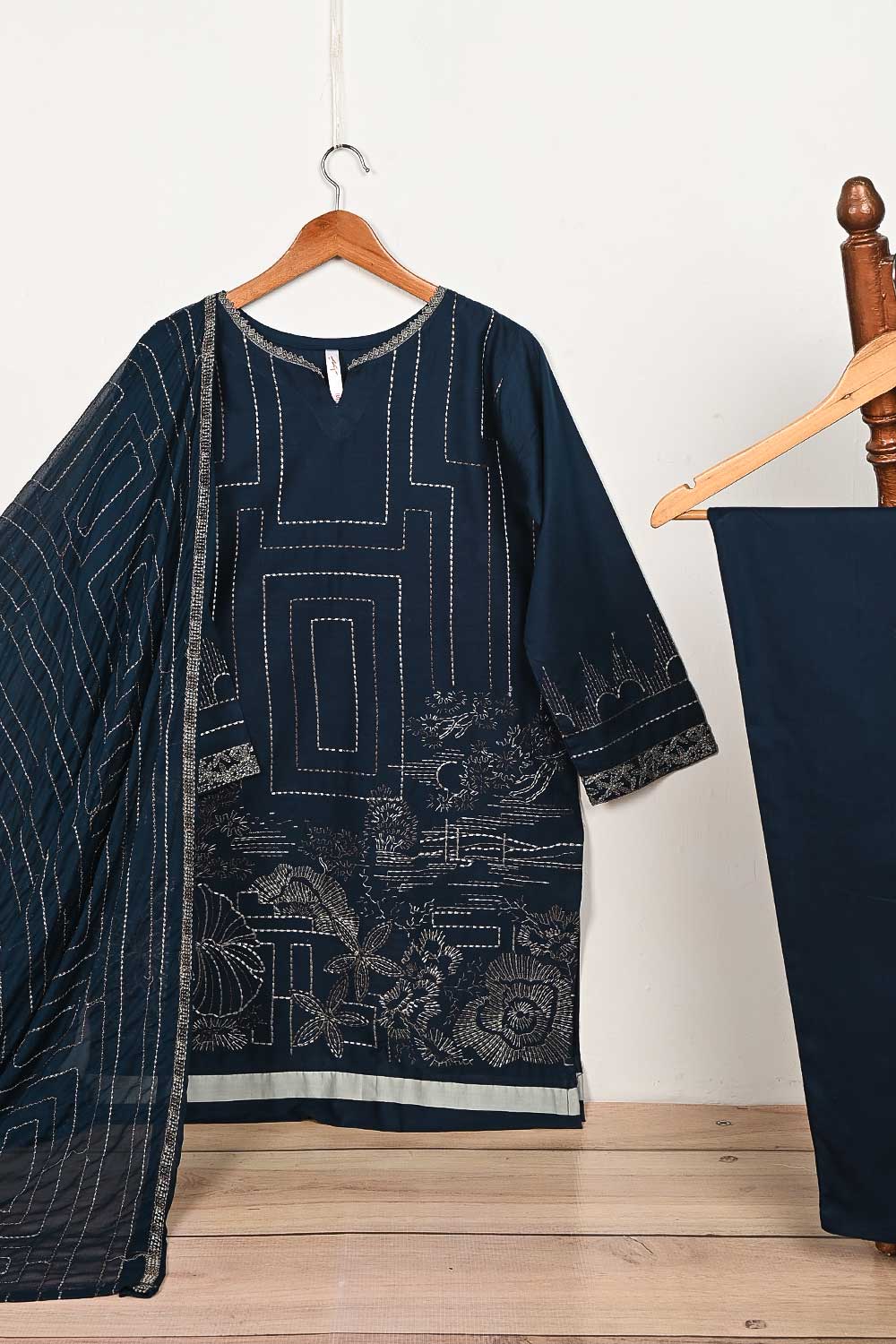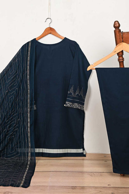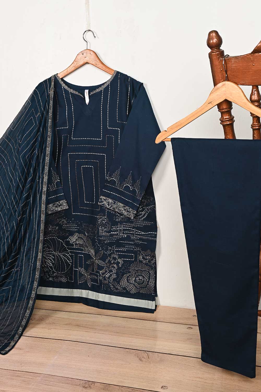 3SP-11A-NavyBlue - 3Pc Cotton Embroidered Dress With Chiffon Embroidered Dupatta
