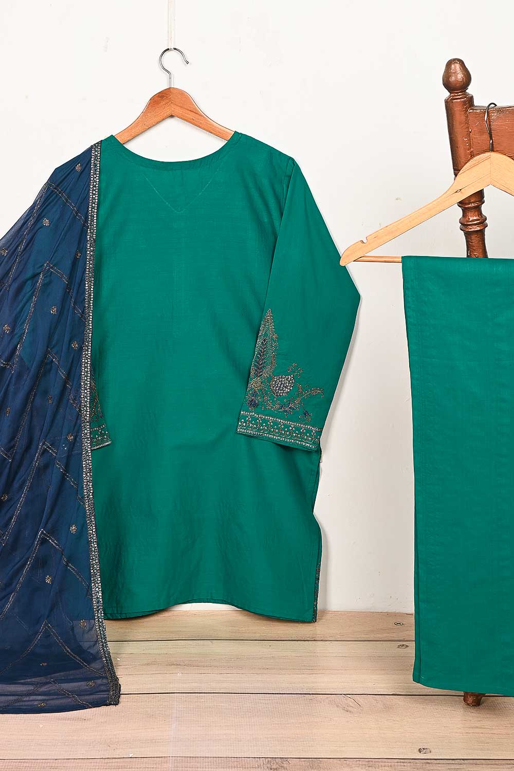3SP-13A-Green - 3PC COTTON EMBROIDERED Dress With Chiffon Embroidered Dupatta