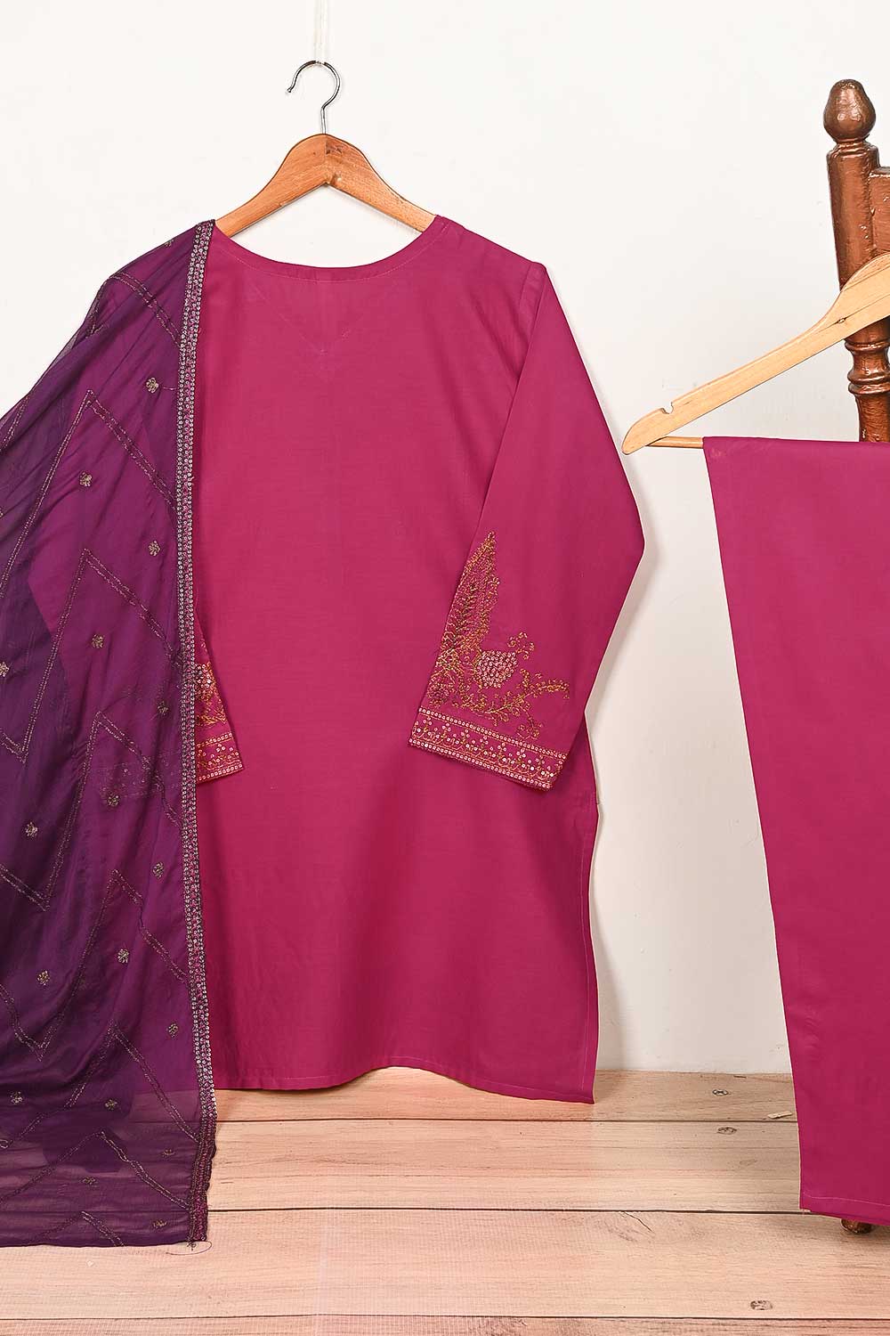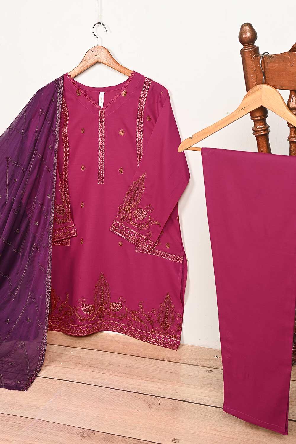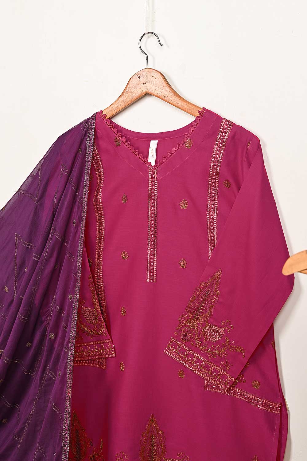 3SP-13B-Fuchsia - 3PC COTTON EMBROIDERED Dress With Chiffon Embroidered Dupatta