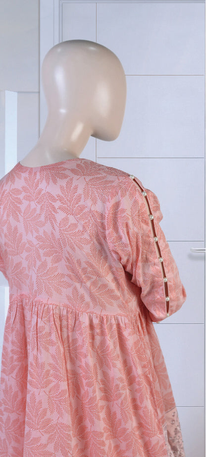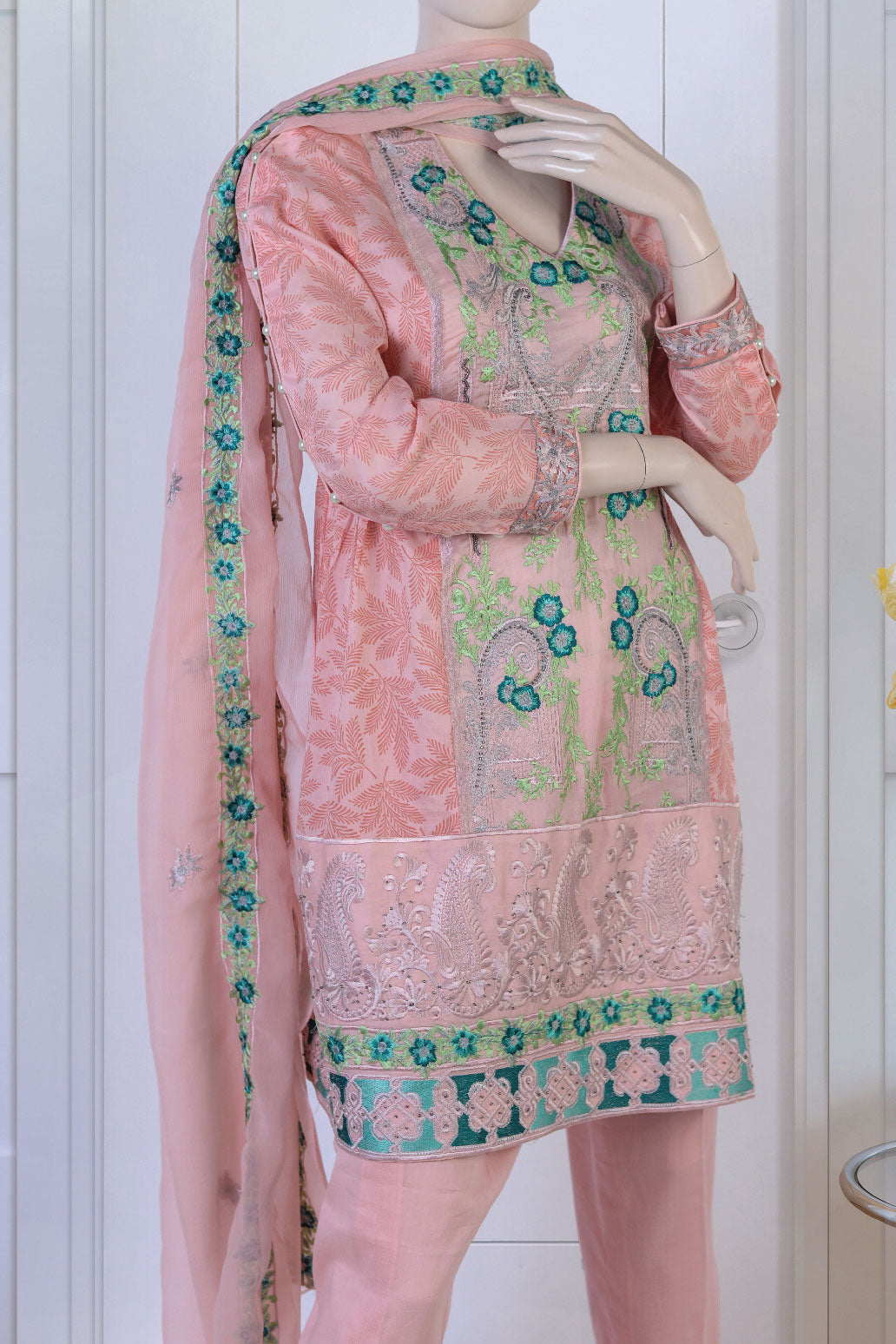 Aesthetically woven fabric highlighted with bold prints of floral beauty and enhanced with intricately embroidered neck-line.