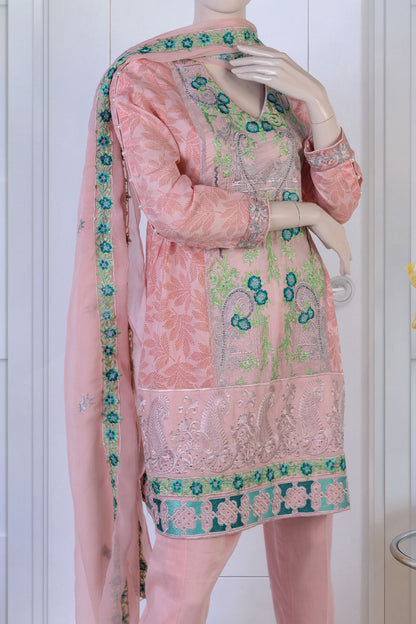 3 piece unstitched cambric stuff embroidered dress with chiffon embroidered dupatta.