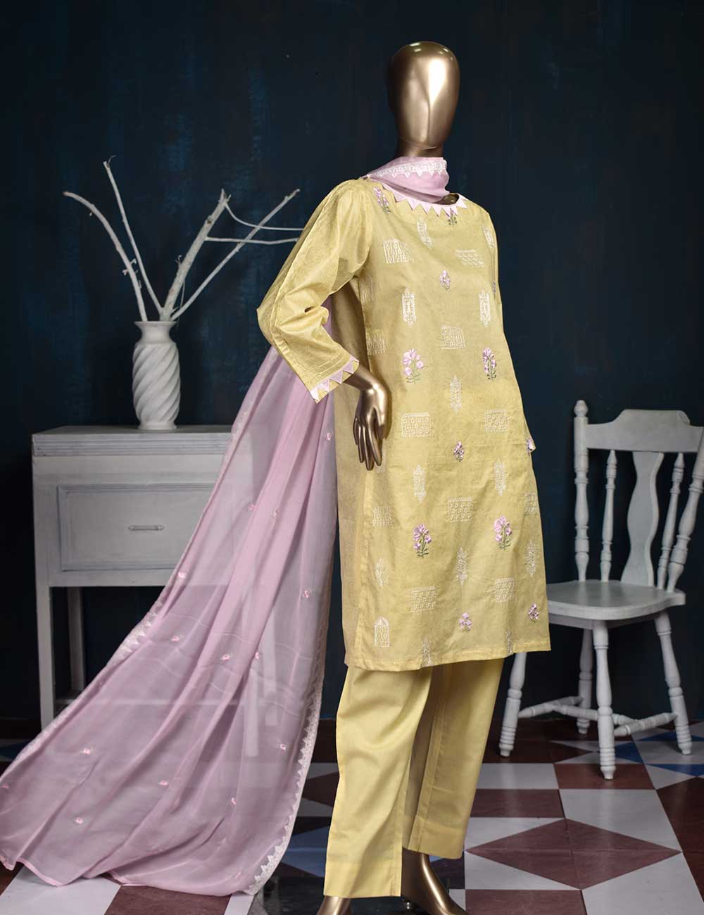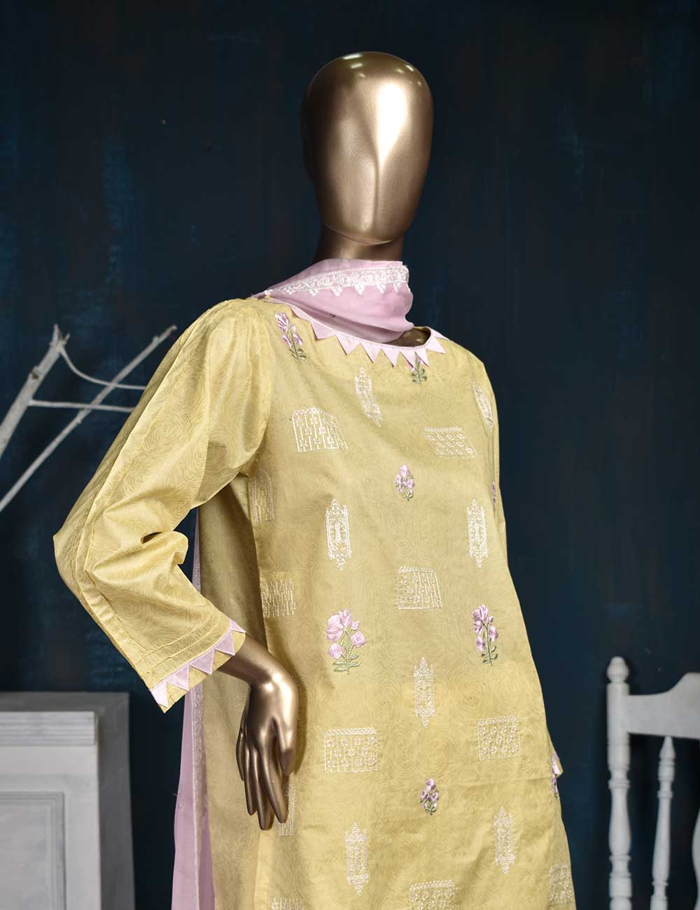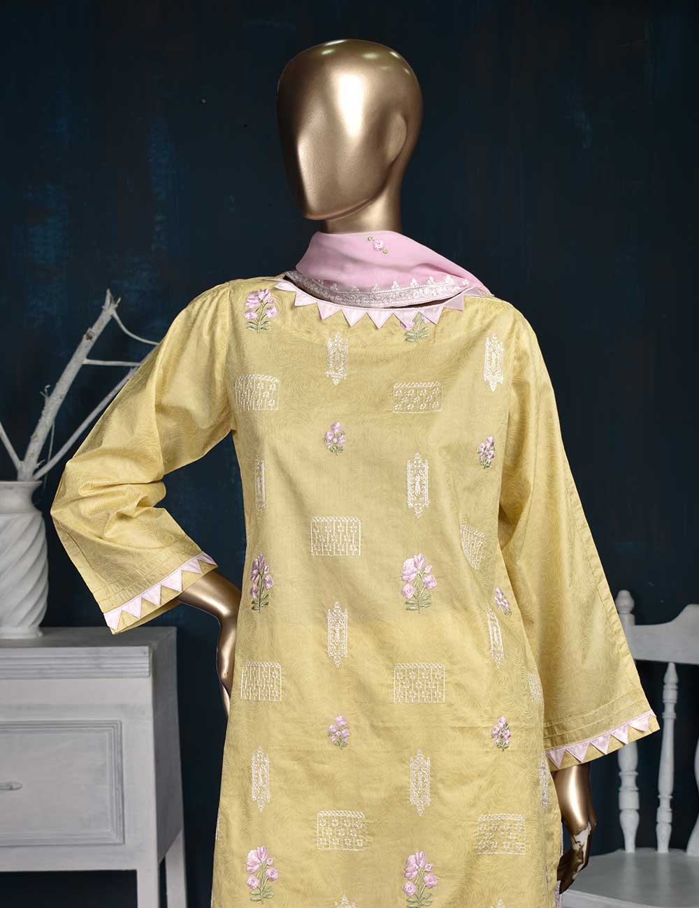 3 Pc Printed and Embroidered Cotton Dress with Embroidered Chiffon Dupatta - Eyebrow (CE-2A-Lemon)