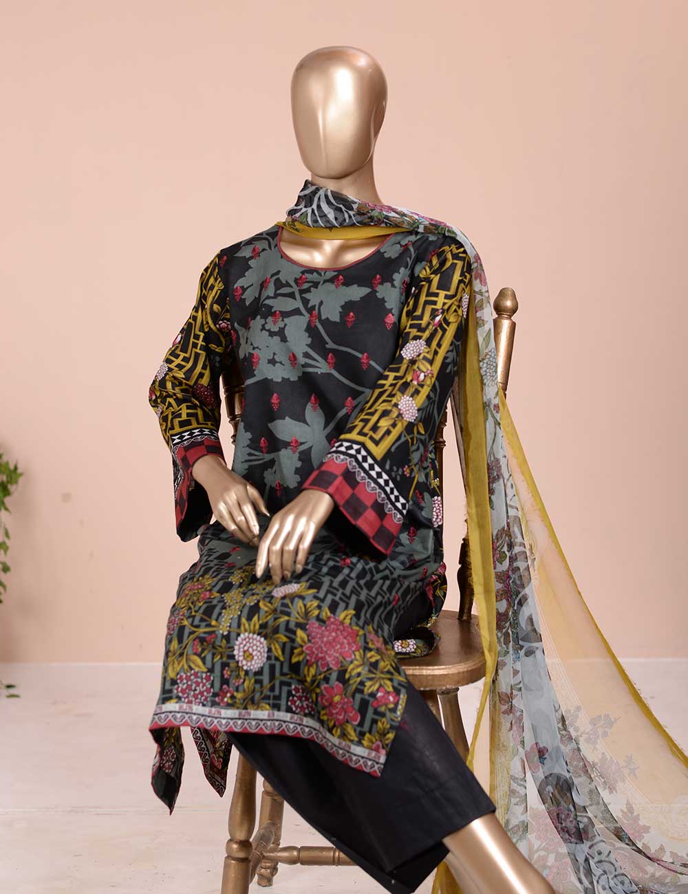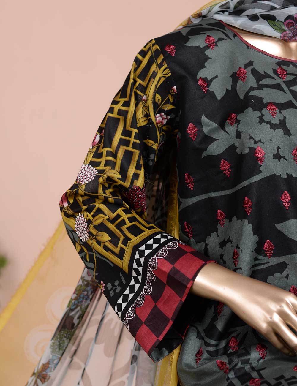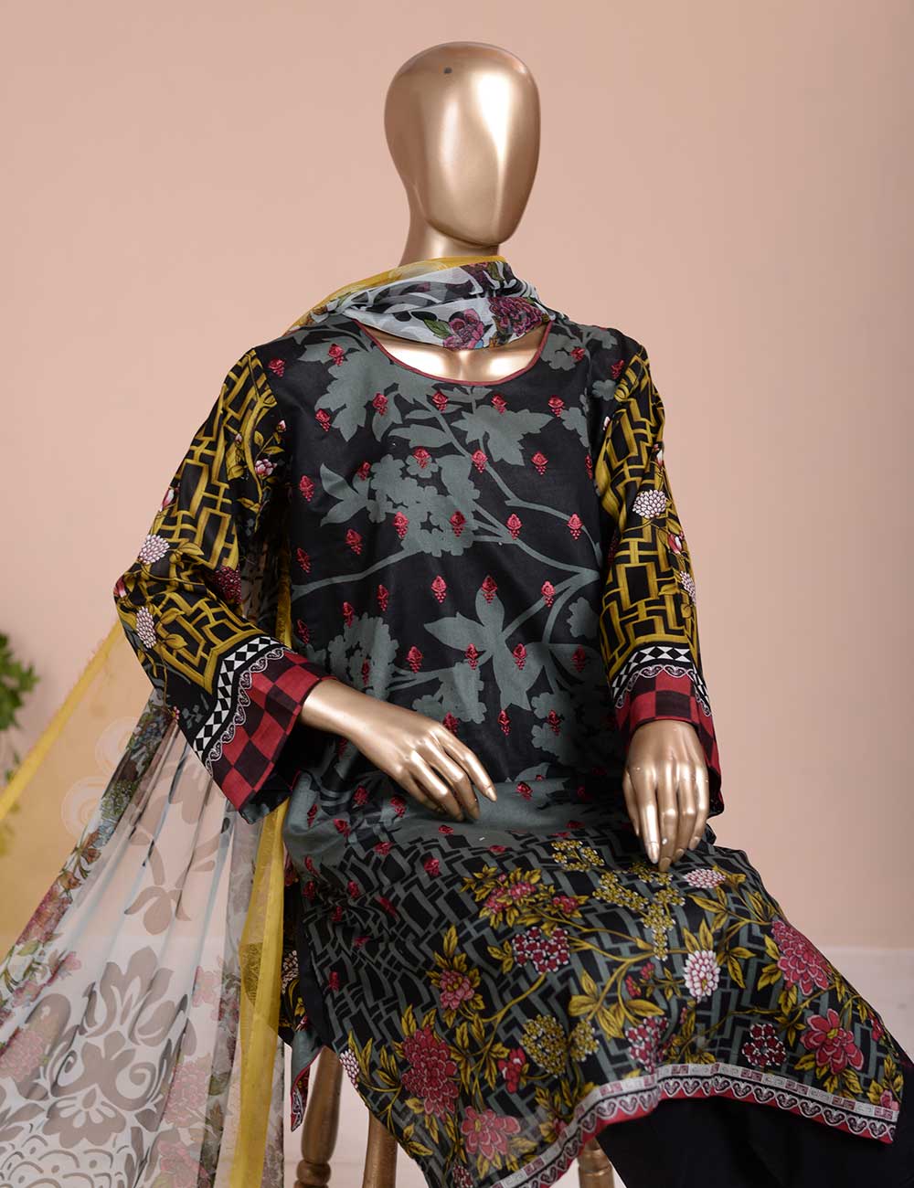 3 Pc Unstitched Lawn Embroidered Dress with Chiffon Dupatta.