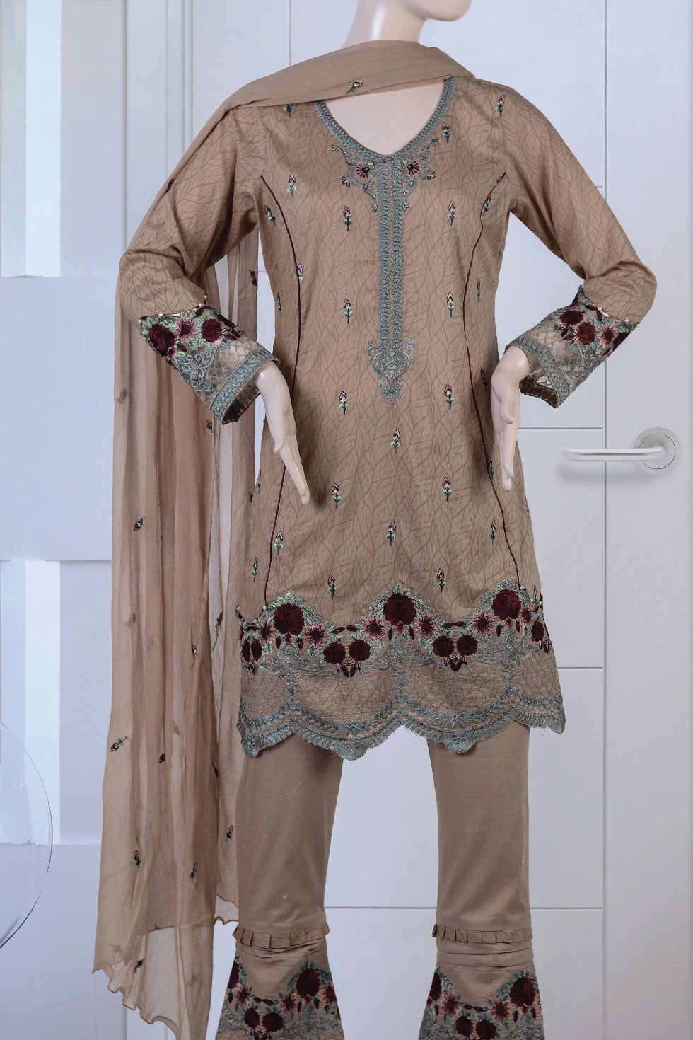 3 piece unstitched cambric stuff embroidered dress with chiffon embroidered dupatta.