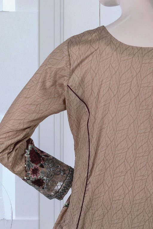 Aesthetically woven fabric highlighted with bold prints of floral beauty and enhanced with intricately embroidered neck-line.