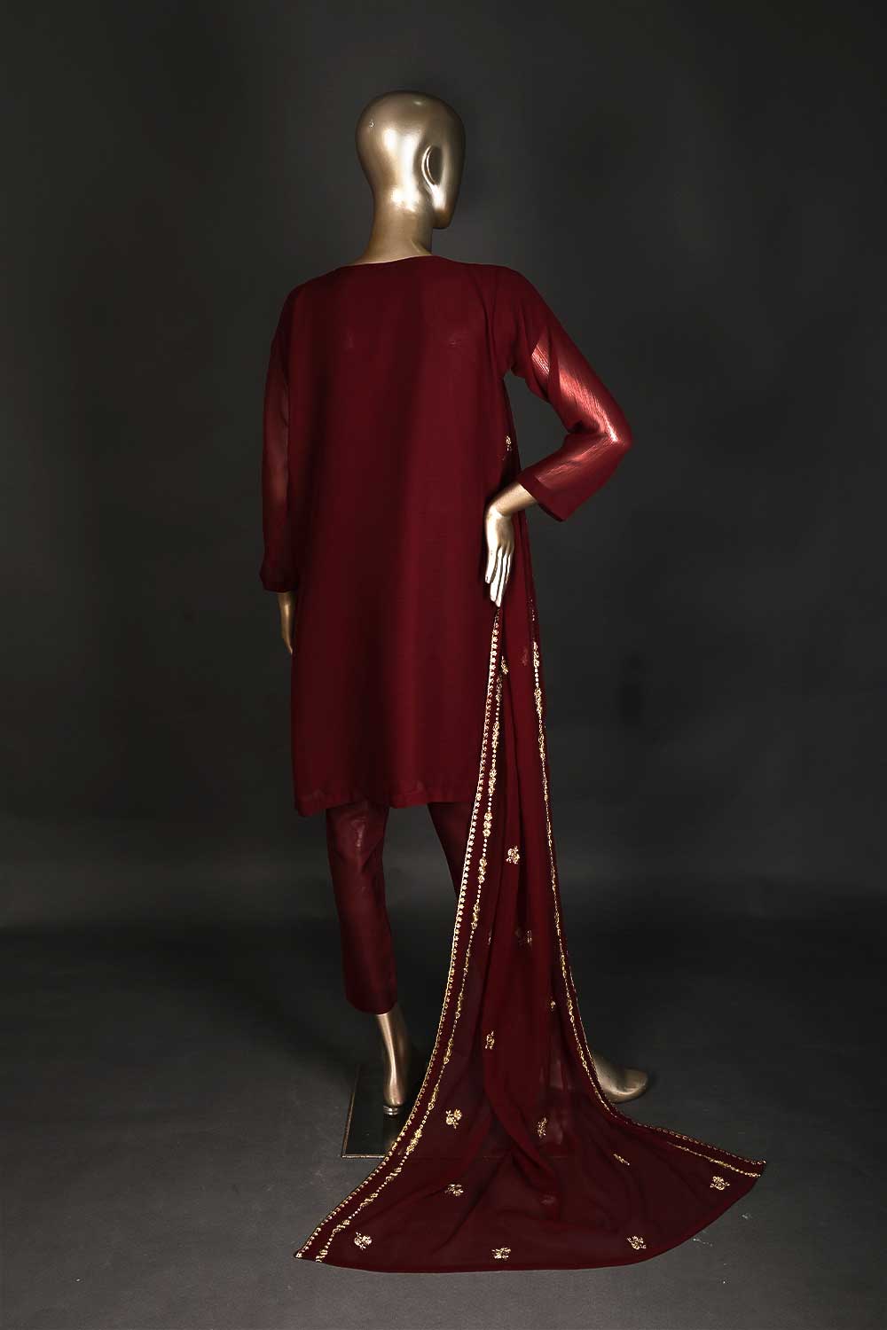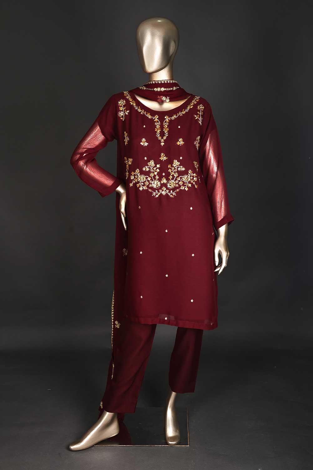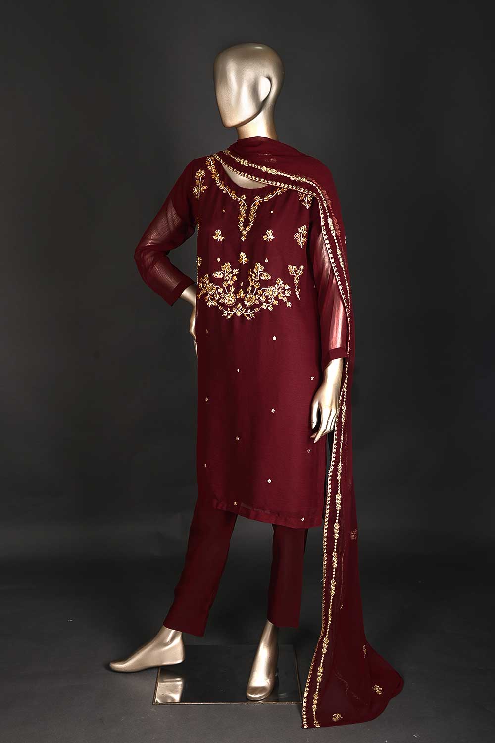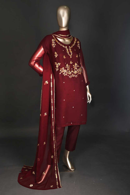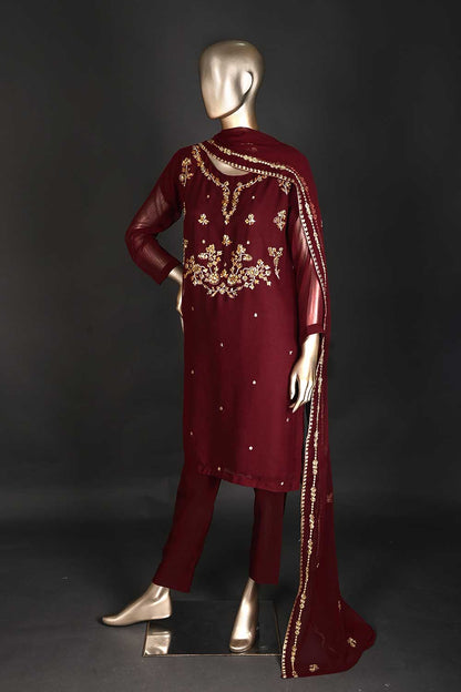 RTW-172-Brownish Maroon - 3Pc Ready to Wear Embroidered Adda Work Chiffon Dress
