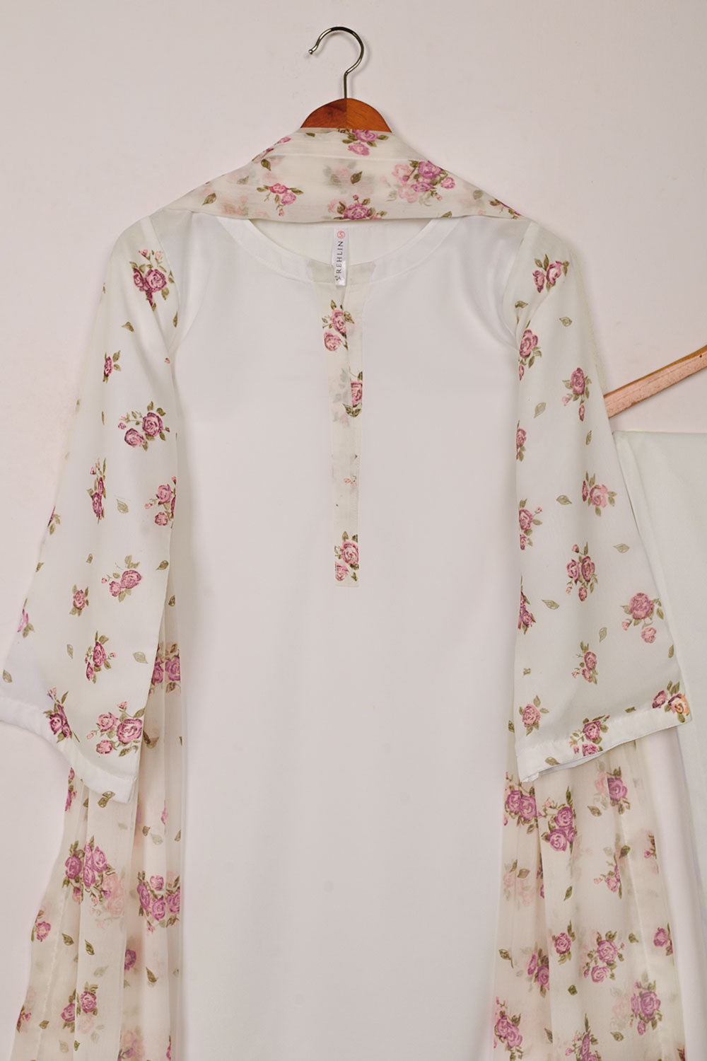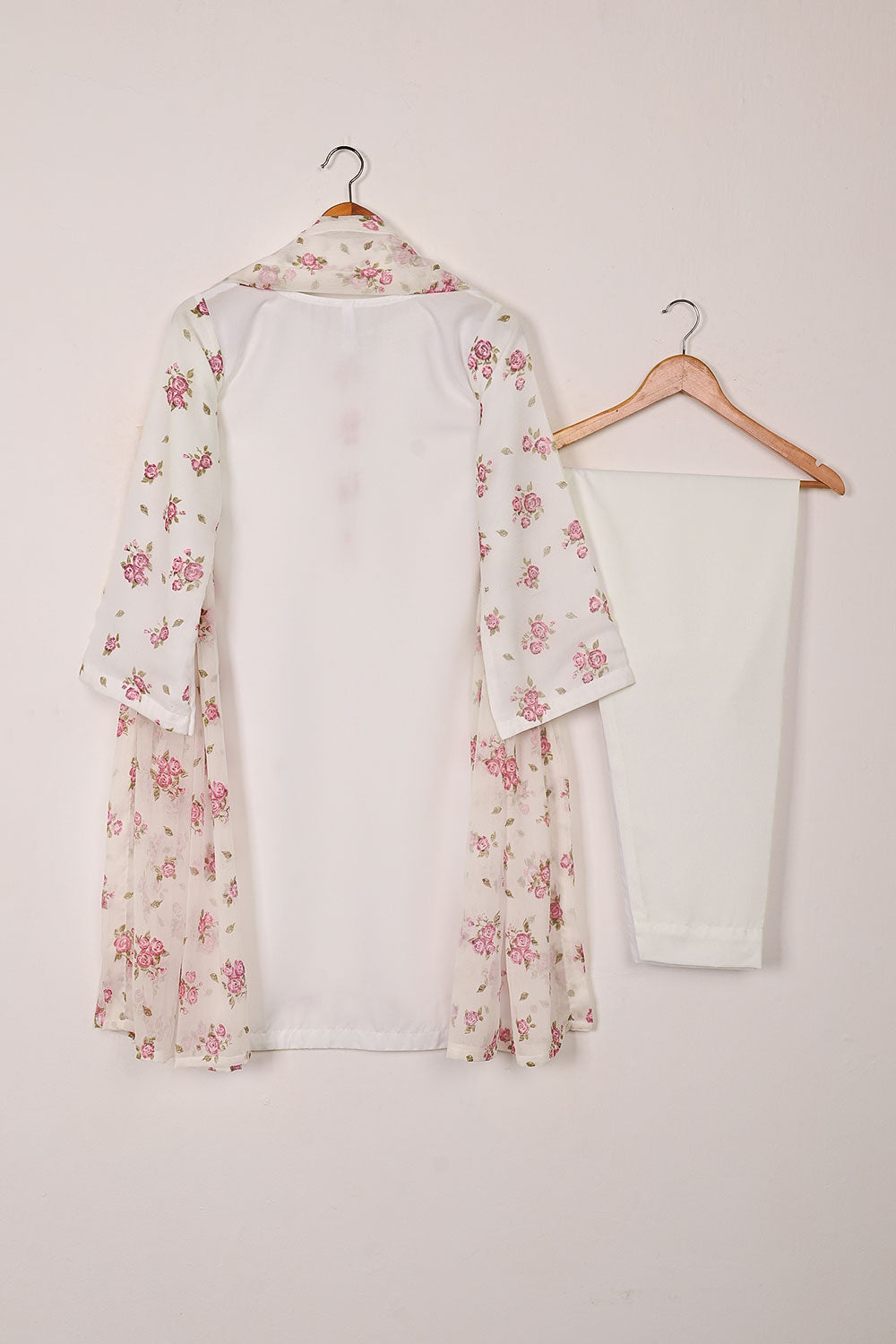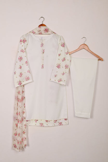 3Pc Ready to Wear Malai Fabric Dress with Chiffon Sleeves, Malai Trouser & Printed Chiffon Dupatta