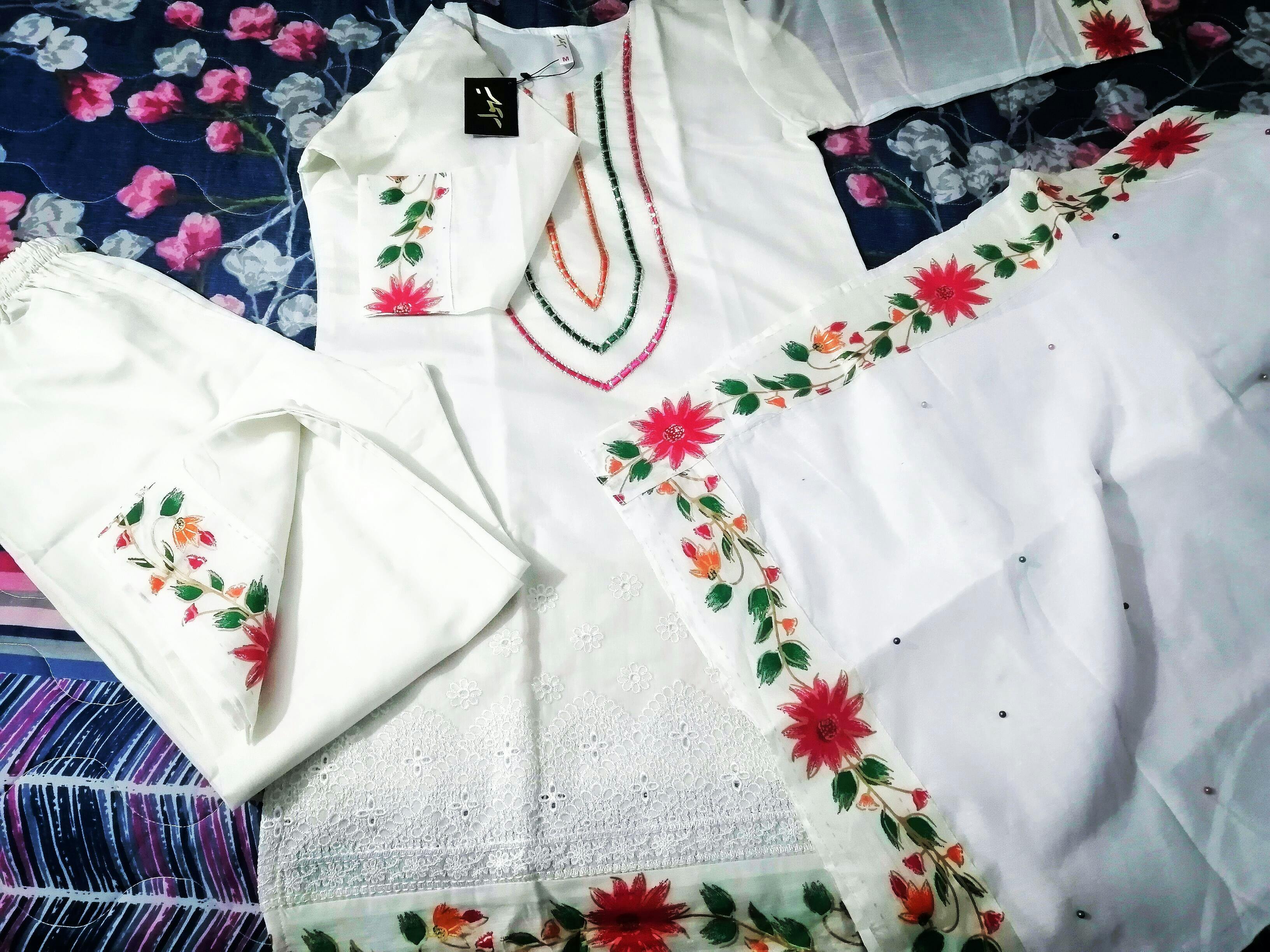 3 Pc Stitched Paper Cotton Chikankari Embroidered Dress with Beautiful Printed Borders.