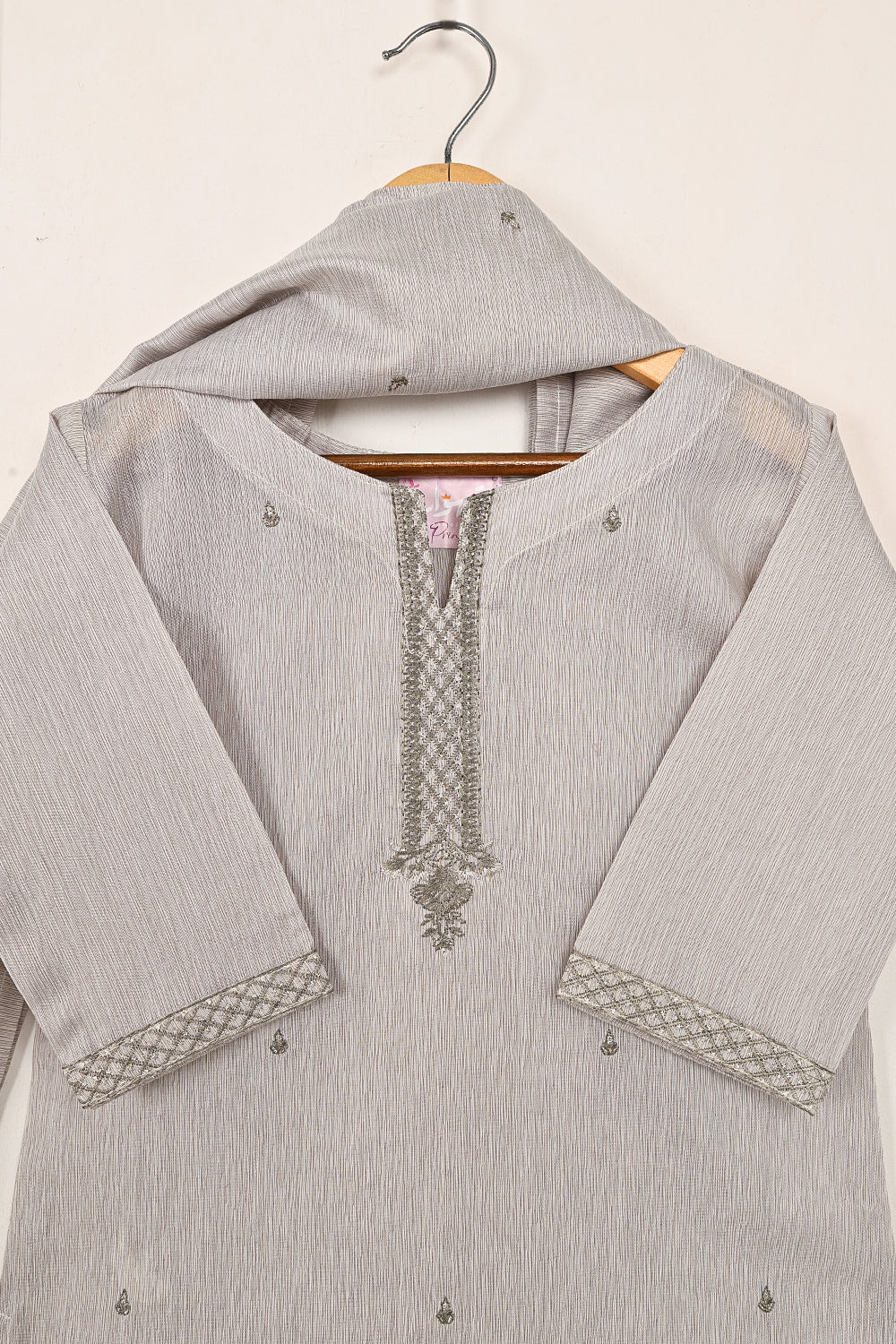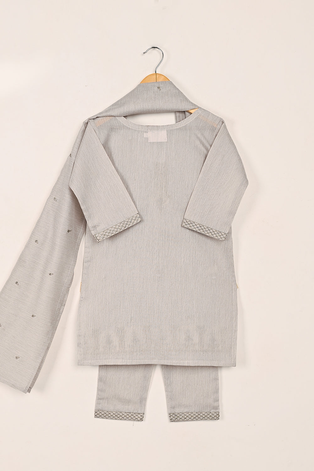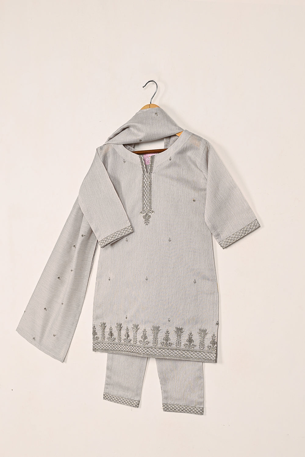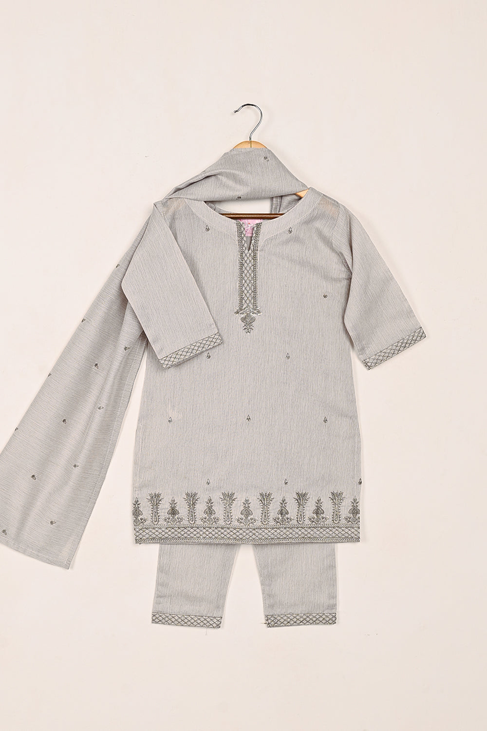 TKF-139-Gray - Kids 3Pc Ready to Wear Embroidered Poly Slub Dress