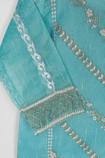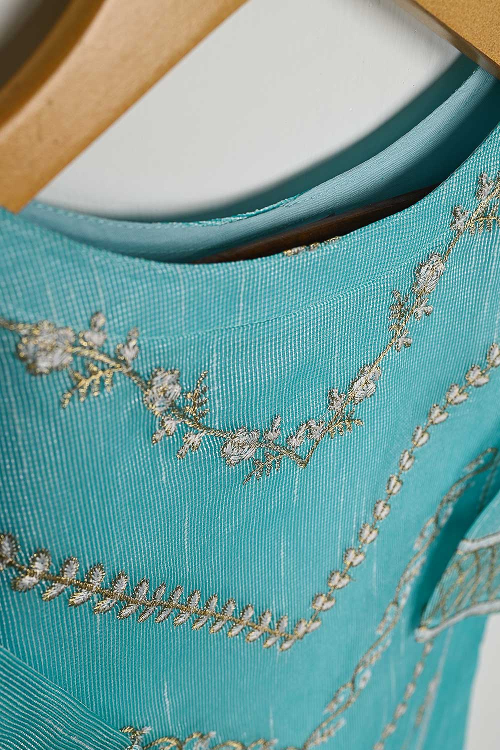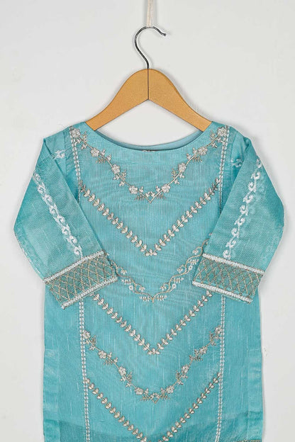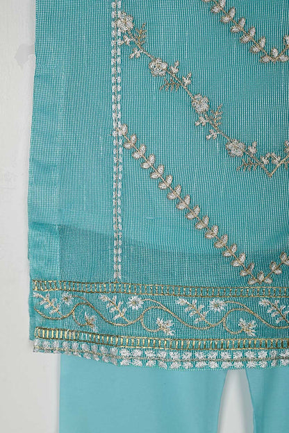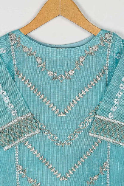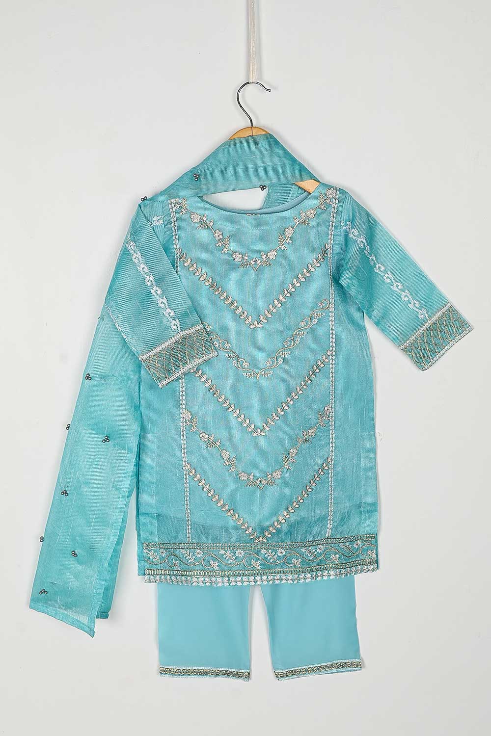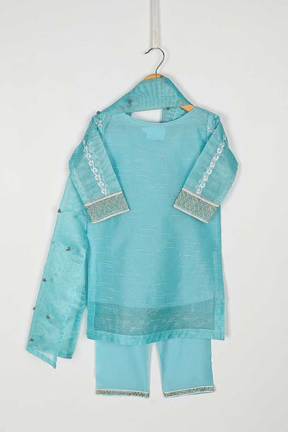 TKF-47-SkyBlue - Kids 3Pc Javeria Net Dress With Malai Trouser