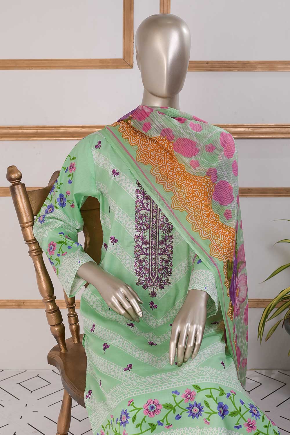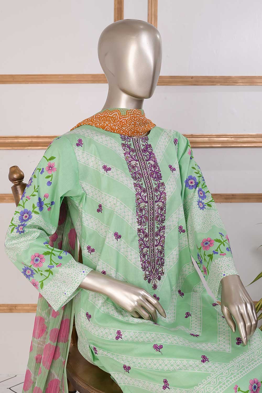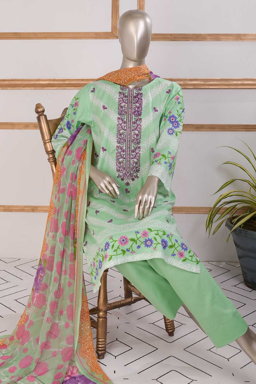 3 Pc Unstitched Embroidered Lawn Dress with Chiffon Printed Dupatta