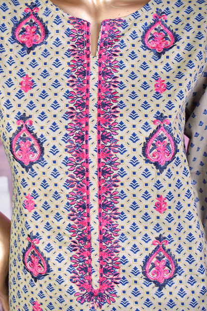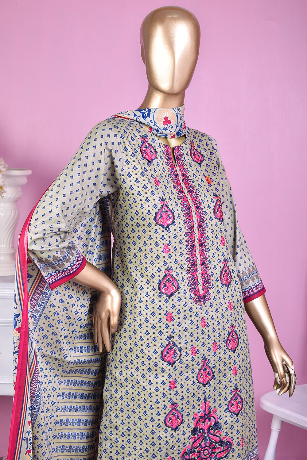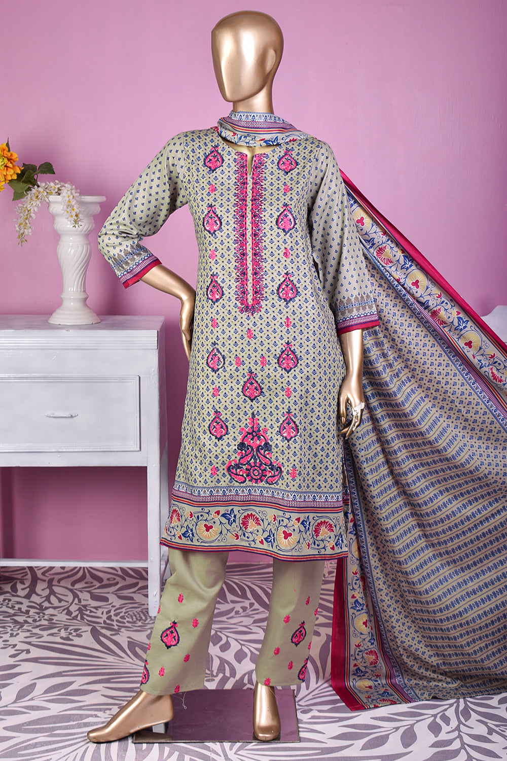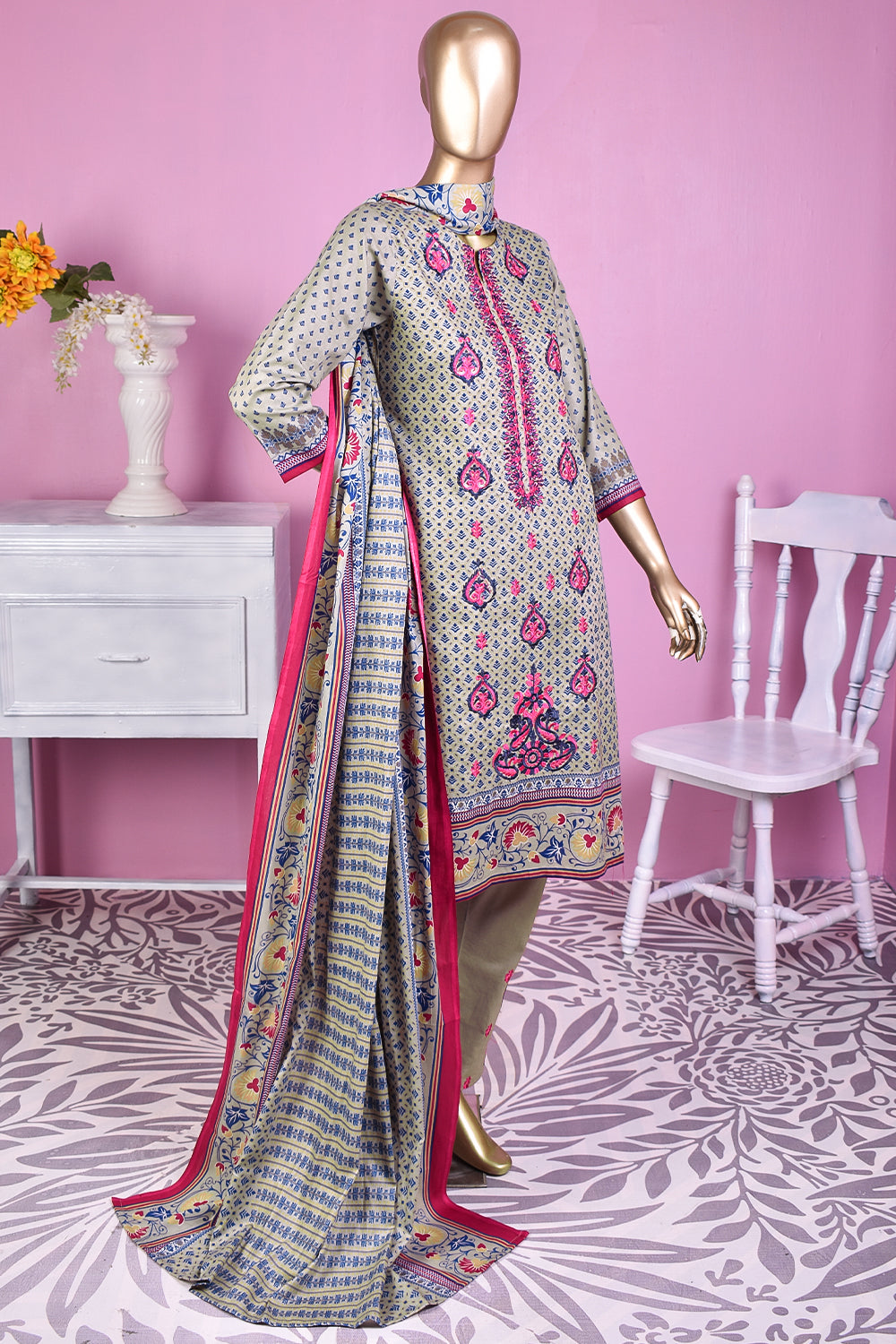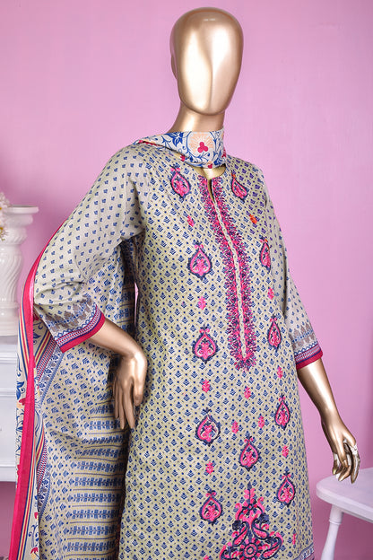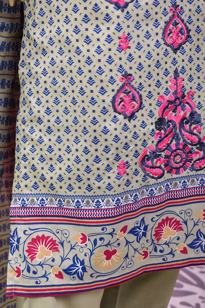 3 Pc Unstitched Embroidered Lawn Dress with Lawn Printed Dupatta & Embroidered Cotton Trouser