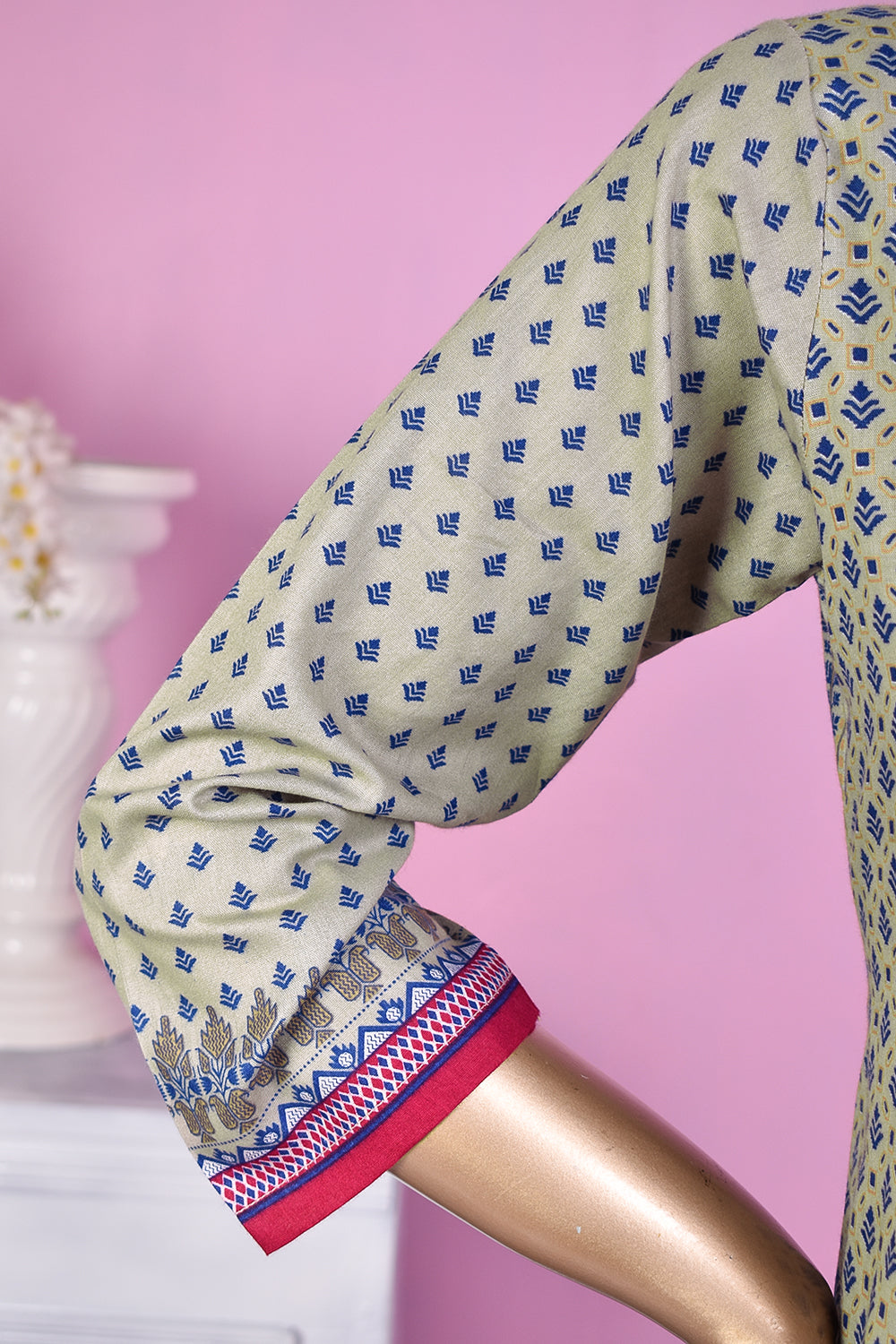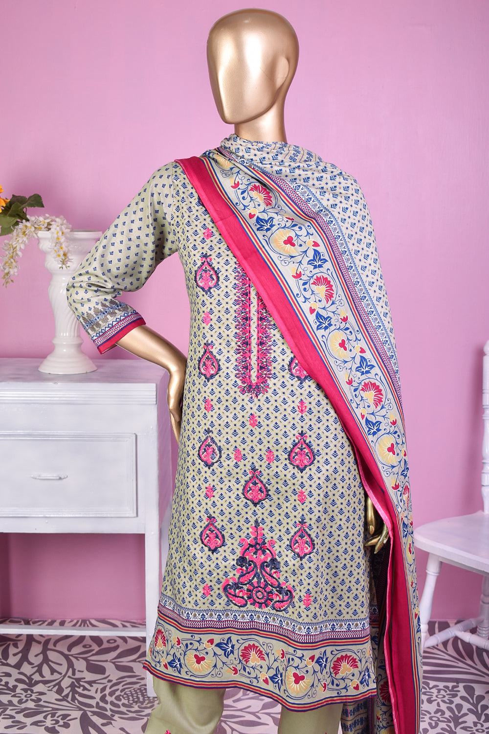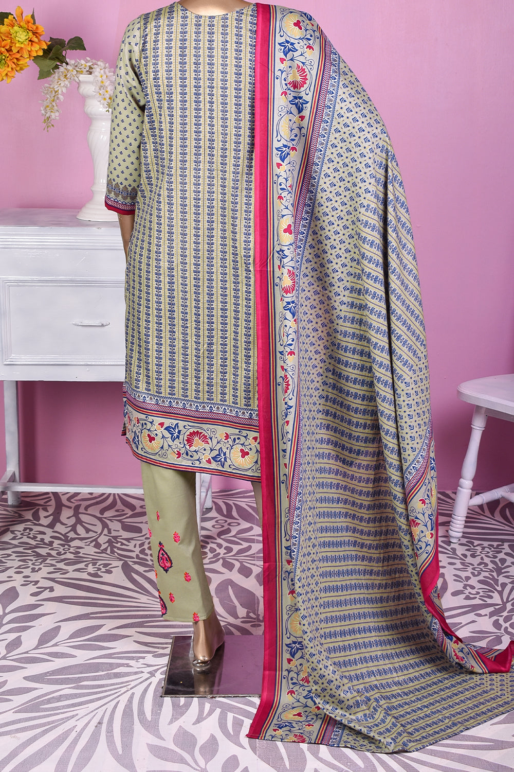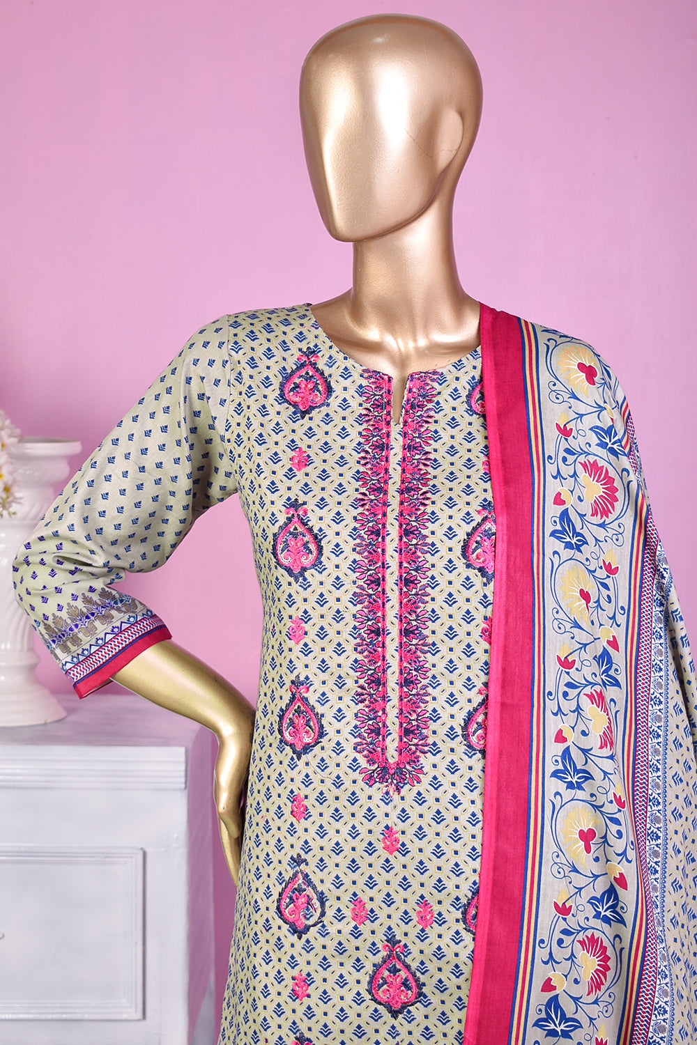 3 Pc Unstitched Embroidered Lawn Dress with Lawn Printed Dupatta & Embroidered Cotton Trouser