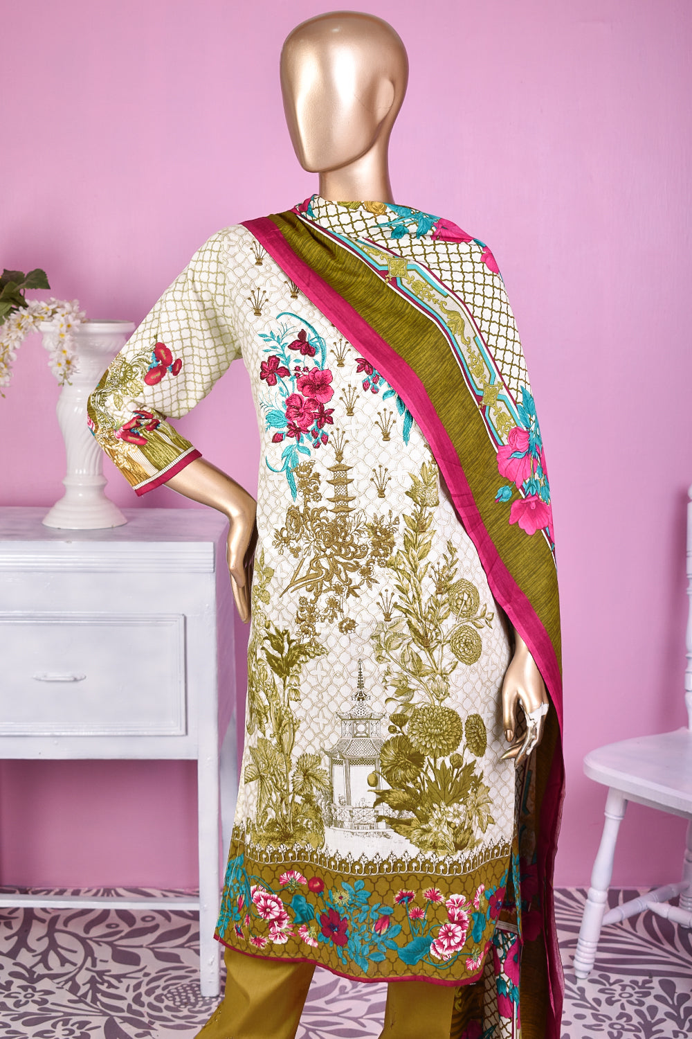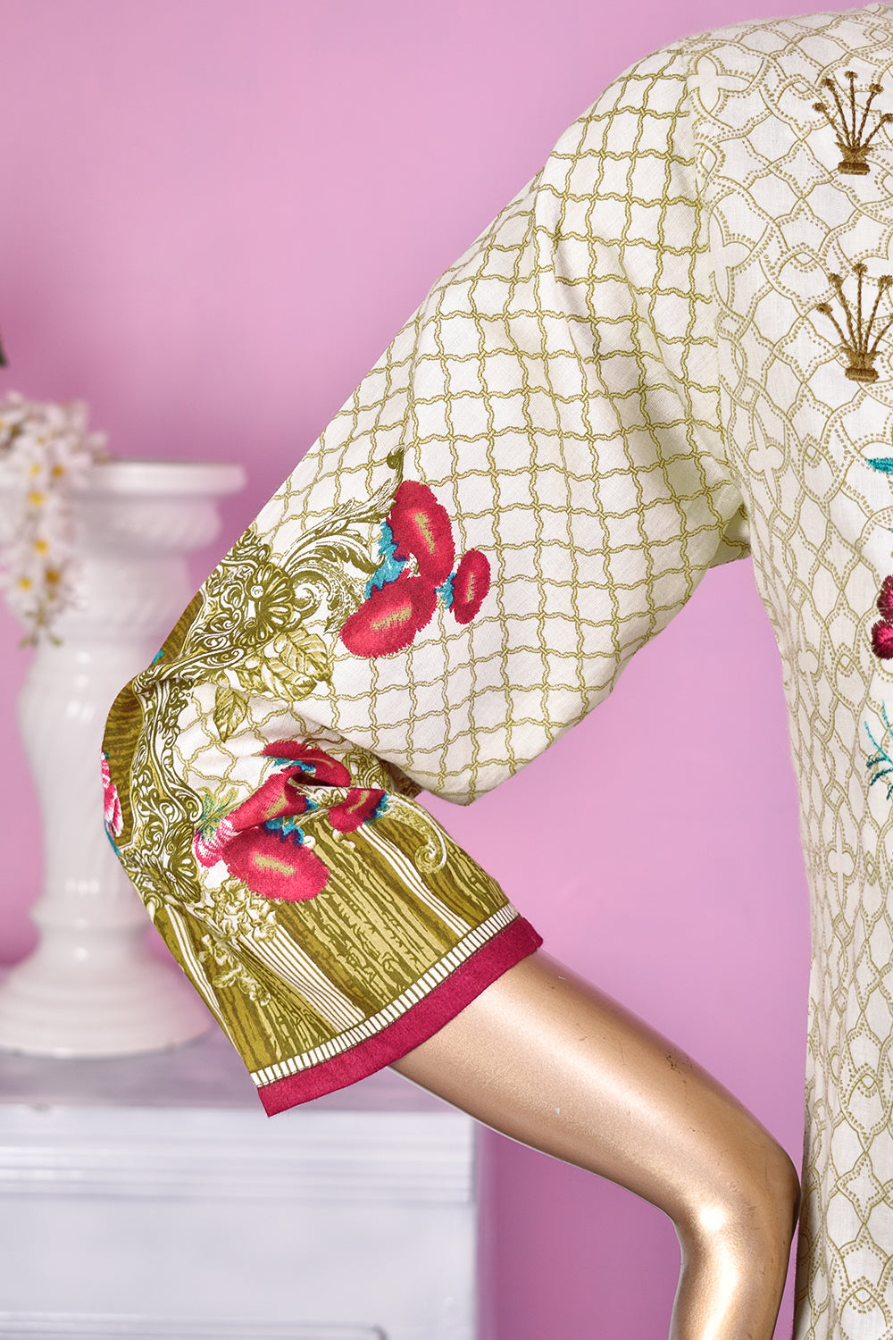 3 Pc Unstitched Embroidered Lawn Dress with Lawn Printed Dupatta & Embroidered Cotton Trouser